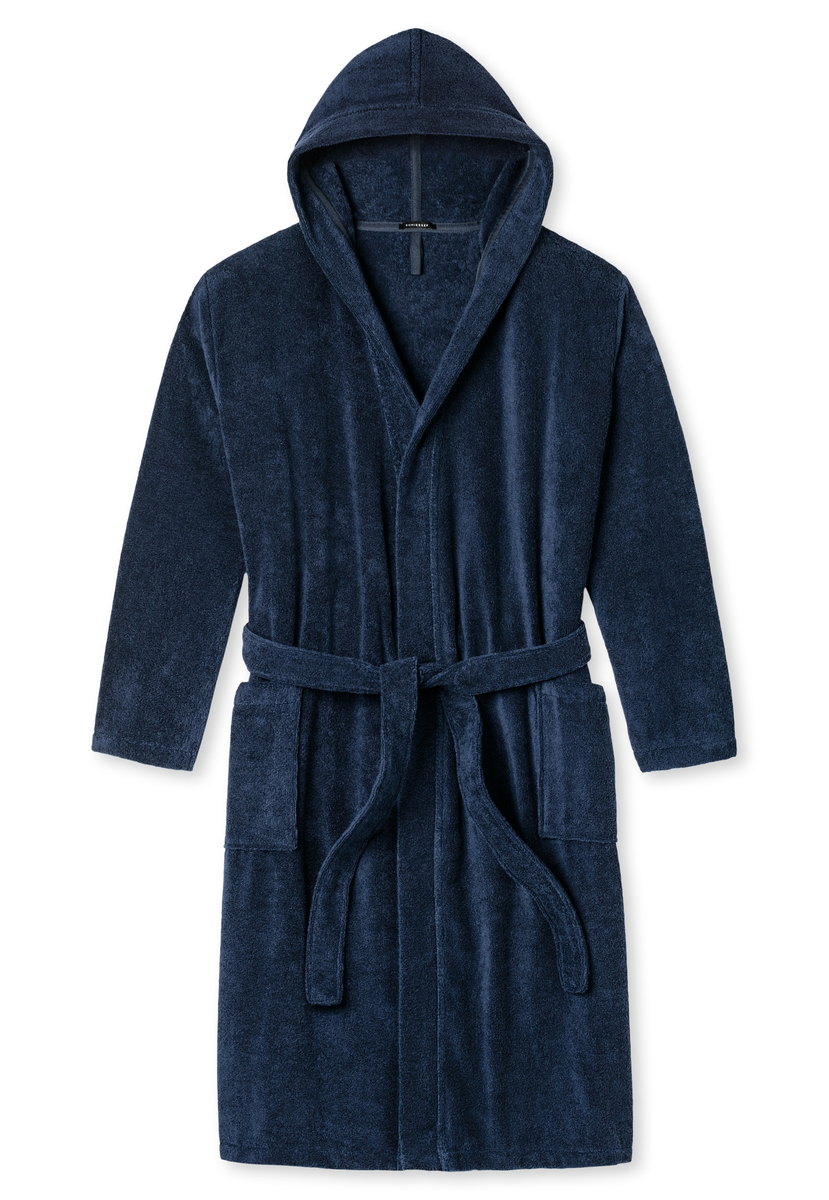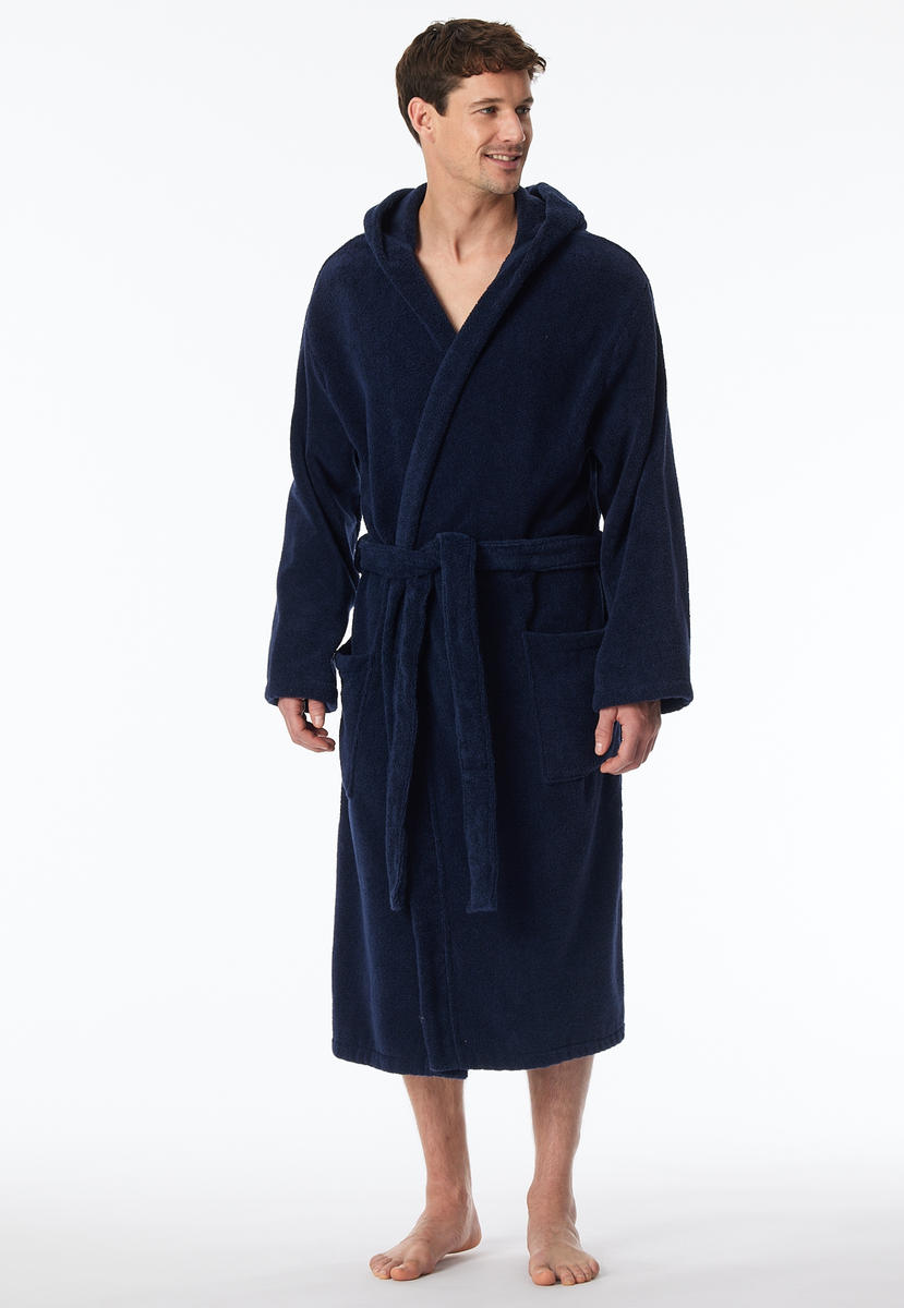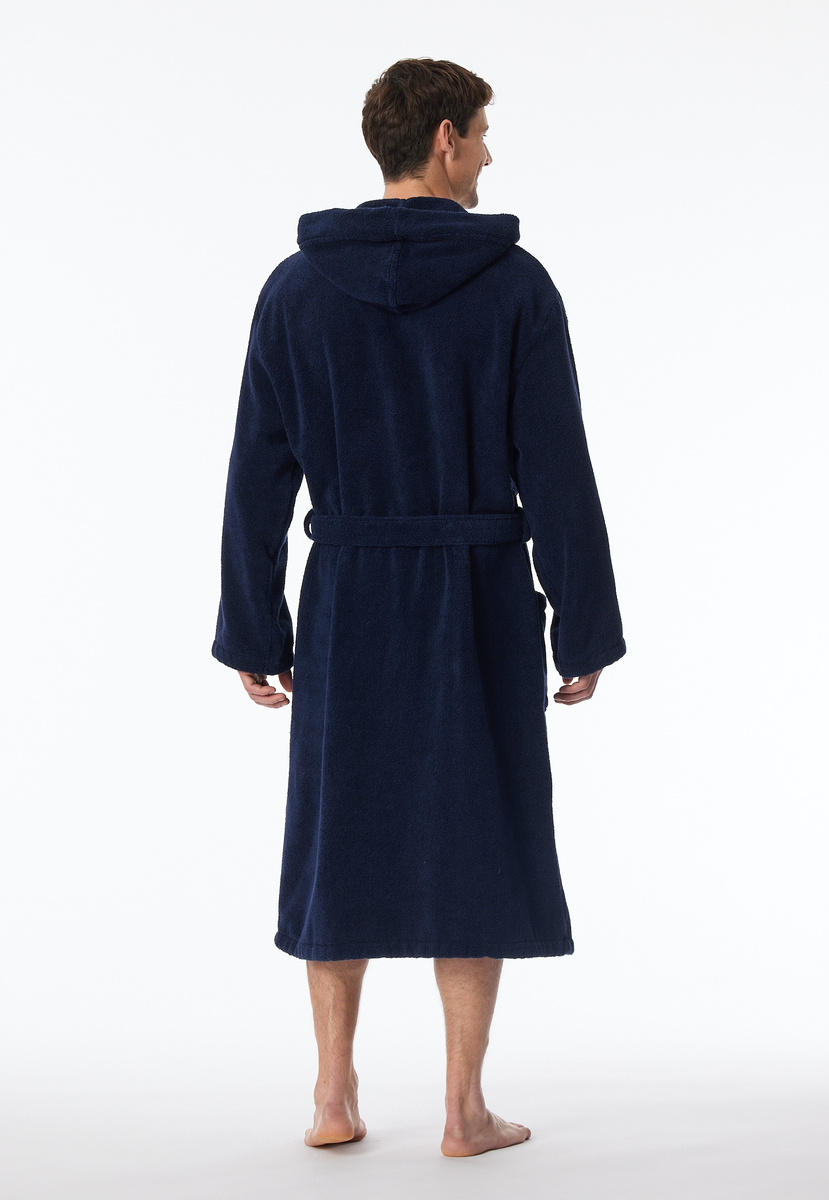 Dieser navyblaue Bademantel schmeichelt anspruchsvollen Herren mit einem angenehm soften Material in bester SCHIESSER-Qualität. Hochwertiger Frottee aus 100% Baumwolle spendet dabei ein behagliches Gefühl auf der Haut und erhält mit der großen Kapuze, einem Bindegürtel und zwei aufgesetzten Taschen stimmige Details. Der perfekte Begleiter nach einem entspannten Vollbad, dem Sauna-Gang oder zum duftenden Kaffee und Tageszeitung am Morgen!