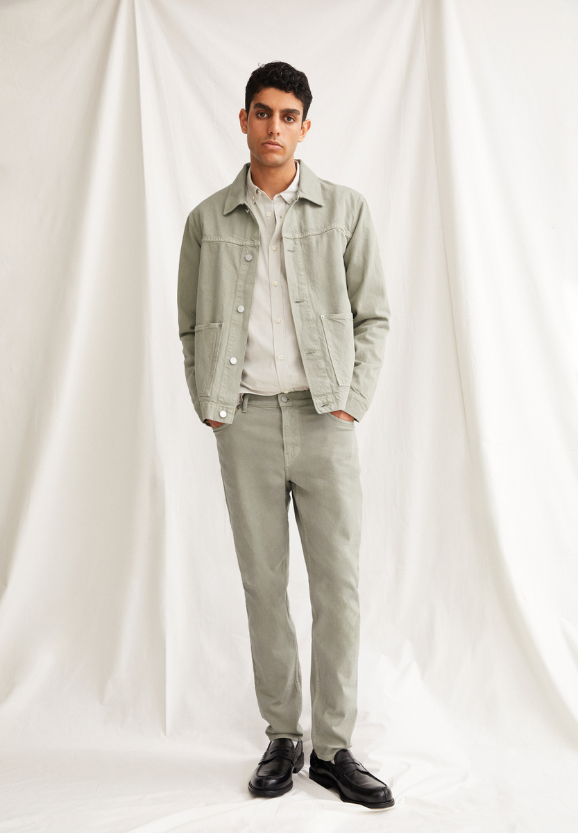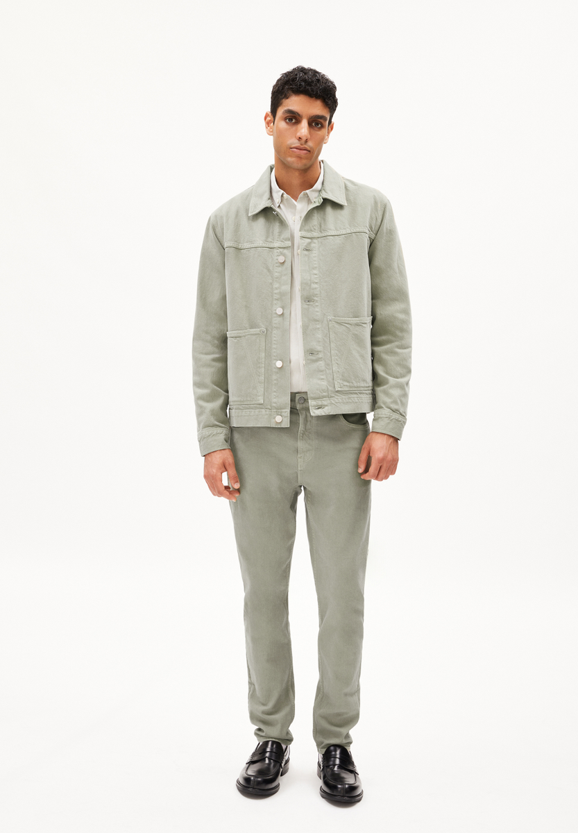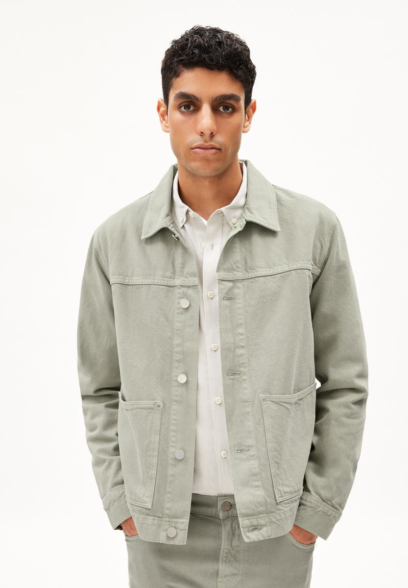 The EVAAN denim jacket made from heavy denim offers a casual, comfortable fit with a shirt collar and button placket. The patch pockets and 100% recycled cotton material ensure comfort and versatility.