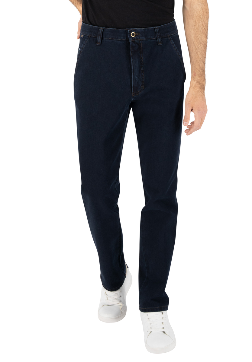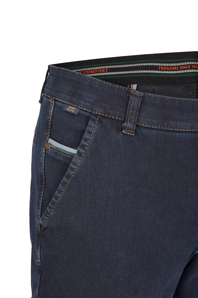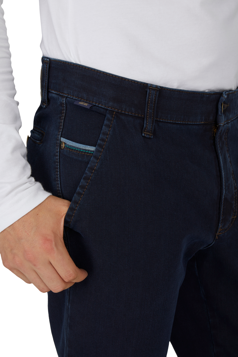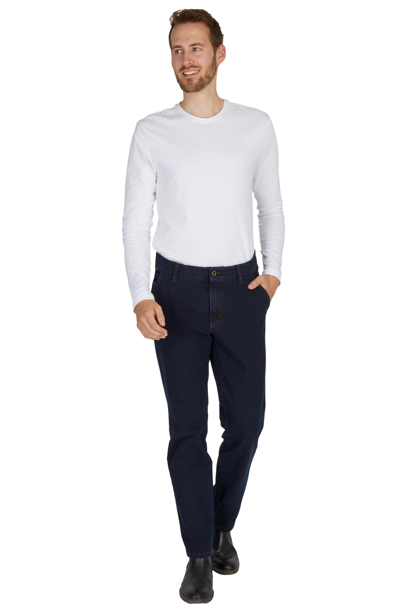 Bequeme Flat Front-Hose mit elastischem Komfortbund und Hemdstopper. Die Münztasche in der rechten Seitentasche bringt einen Hauch Sportivität in den Look. Gefertigt aus superelastischem Bi-Stretch-Denim, der in Längs- und Querrichtung hochelastisch ist. Dank einer T400-Beimischung bleibt die Hose trotz extremer Elastizität absolut formstabil. Gewicht: 570 g/lfm Das Modell bietet eine normale Leibhöhe und wegen der schmaleren Fußweite einen schlankeren Beinverlauf