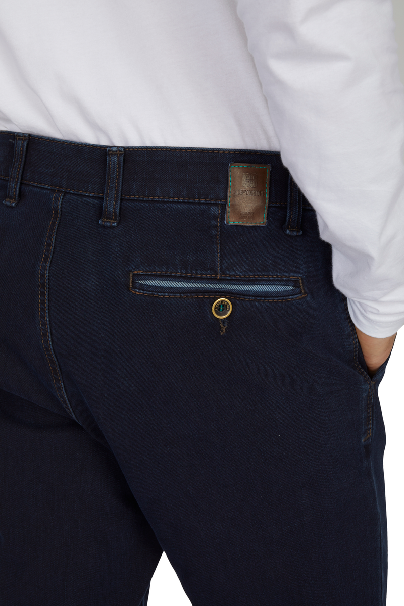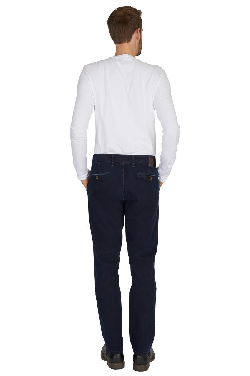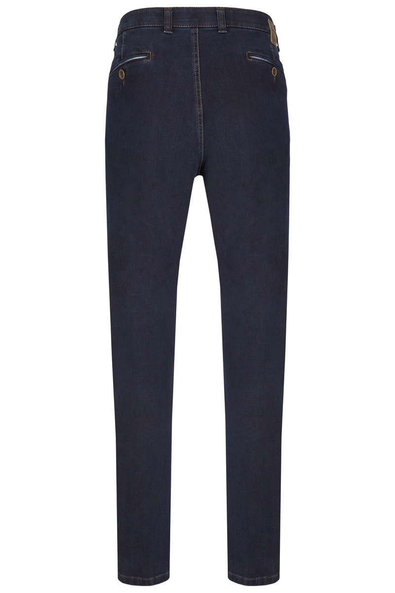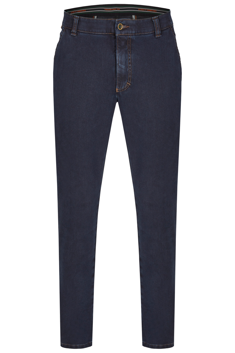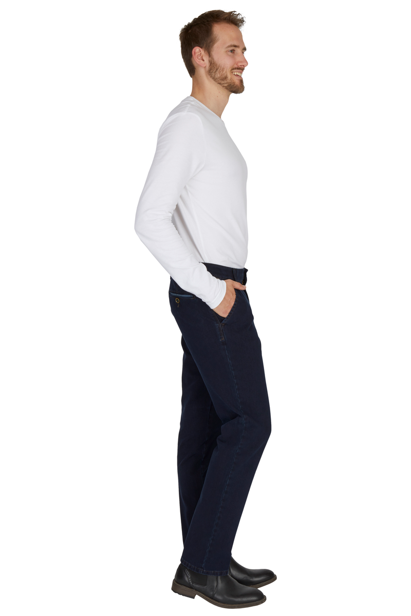 Bequeme Flat Front-Hose mit elastischem Komfortbund und Hemdstopper. Die Münztasche in der rechten Seitentasche bringt einen Hauch Sportivität in den Look. Gefertigt aus superelastischem Bi-Stretch-Denim, der in Längs- und Querrichtung hochelastisch ist. Dank einer T400-Beimischung bleibt die Hose trotz extremer Elastizität absolut formstabil. Gewicht: 570 g/lfm Das Modell bietet eine normale Leibhöhe und wegen der schmaleren Fußweite einen schlankeren Beinverlauf