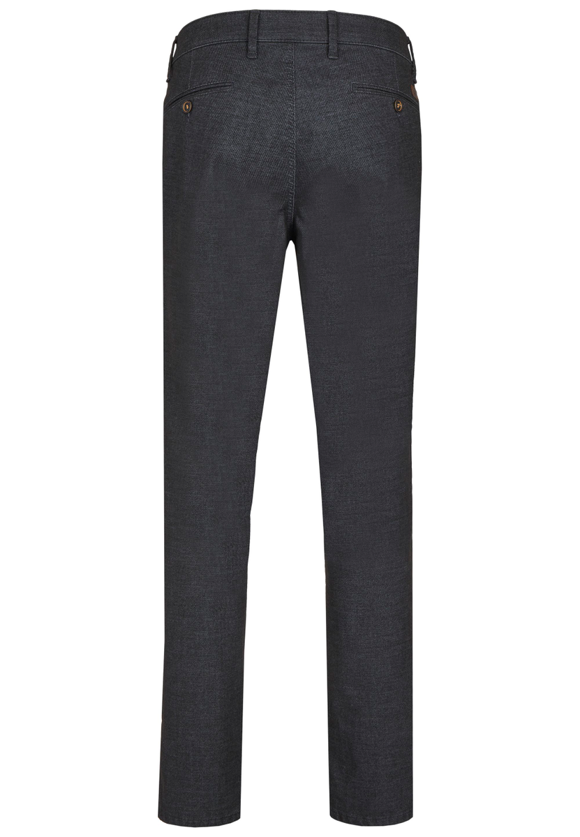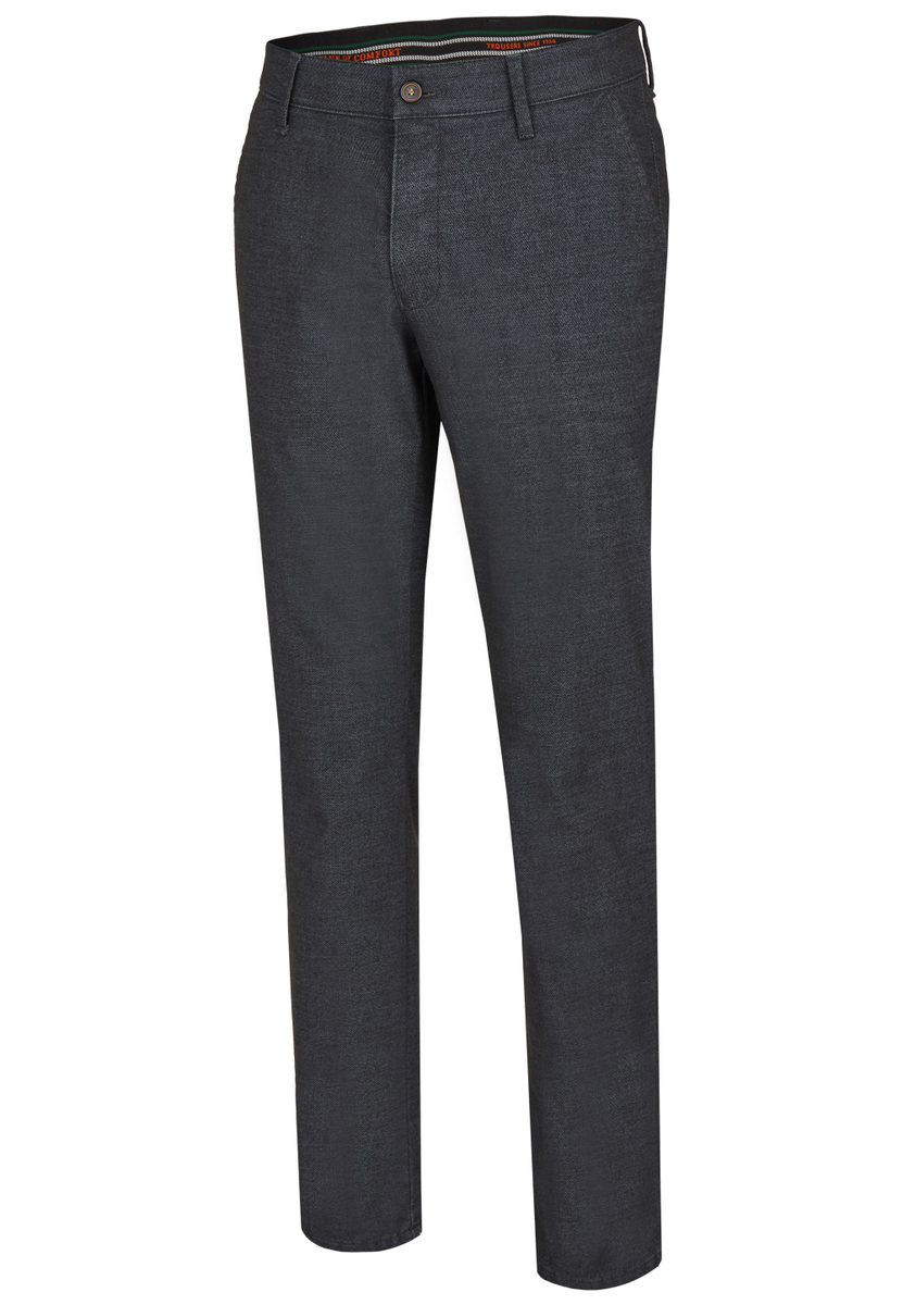 Bequeme Flat Front-Hose mit elastischem Komfortbund und Hemdstopper. Gefertigt auf Basis eines Baumwoll-Struktur-Mischgewebes mit einer Woll-Optik, die eine schöne Melange (mehrfarbiges Garn) zeigt. Gewicht: 400 g/lfm Das Modell bietet eine normale Leibhöhe und wegen der schmaleren Fußweite einen schlankeren Beinverlauf