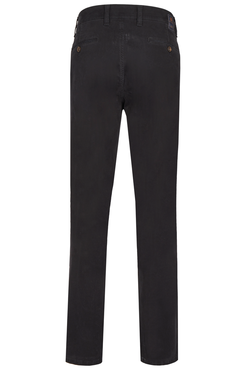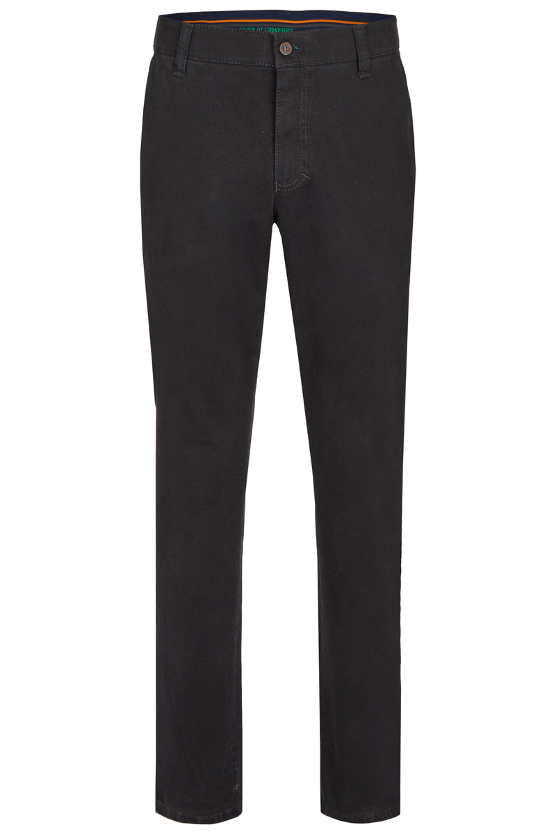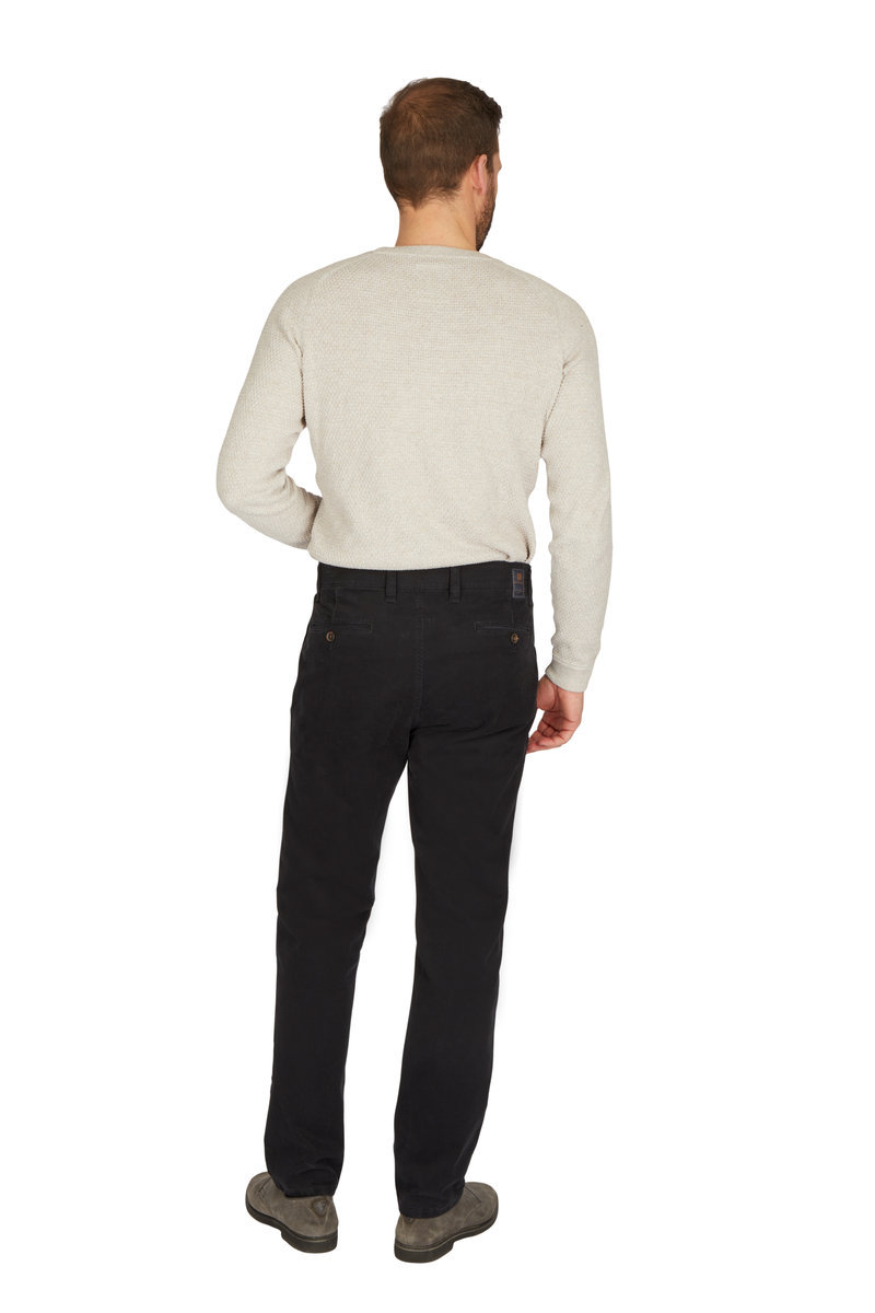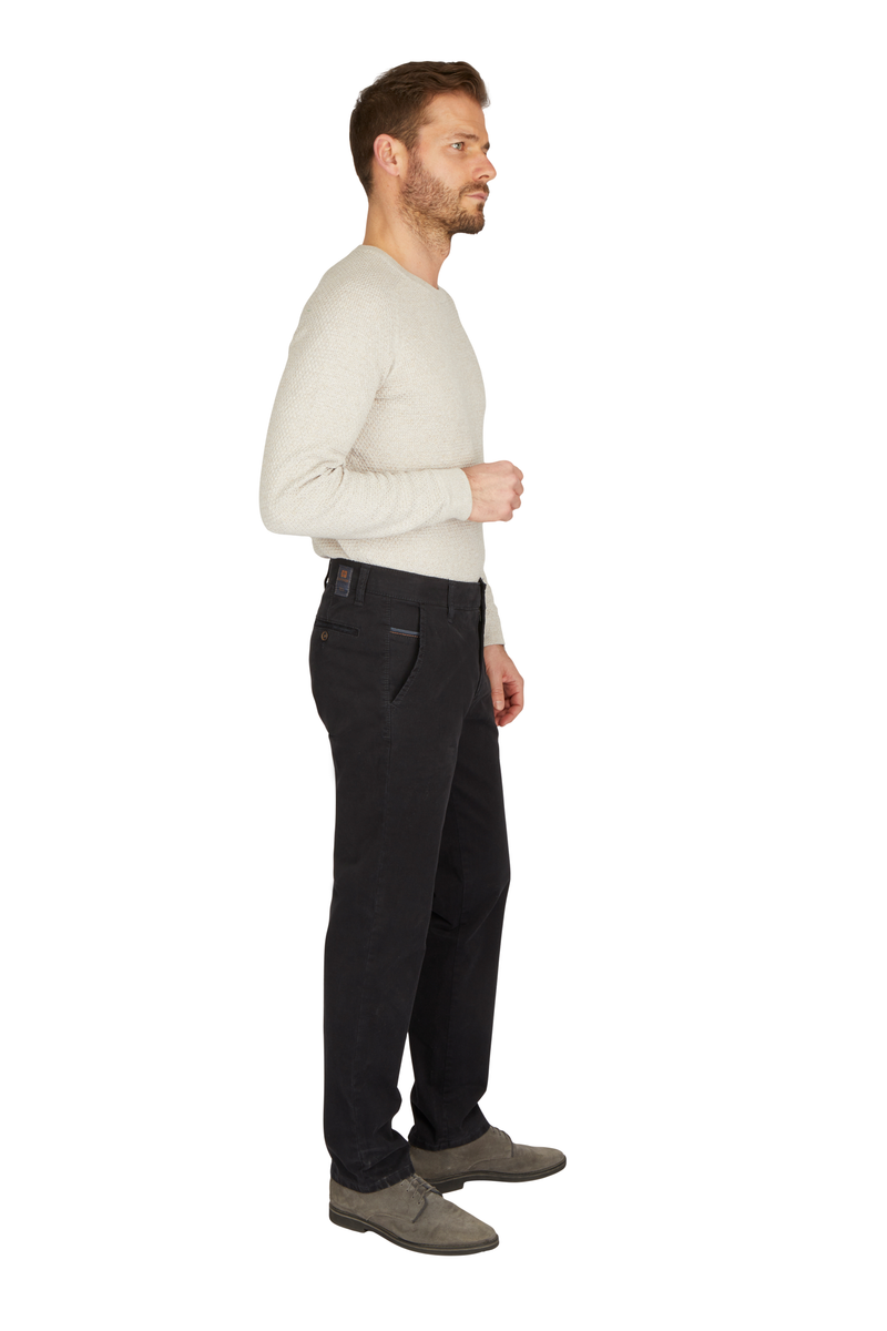 Bequeme Flat Front-Hose mit elastischem Komfortbund und Hemdstopper. Die Münztasche in der rechten Seitentasche bringt einen Hauch Sportivität in den Look. Gefertigt aus einer hochelastischen High Stretch-Baumwolle mit wunderschönem Warenbild und maskulinem Griff. Gewicht: 400 g/lfm Das Modell bietet eine normale Leibhöhe und wegen der schmaleren Fußweite einen schlankeren Beinverlauf