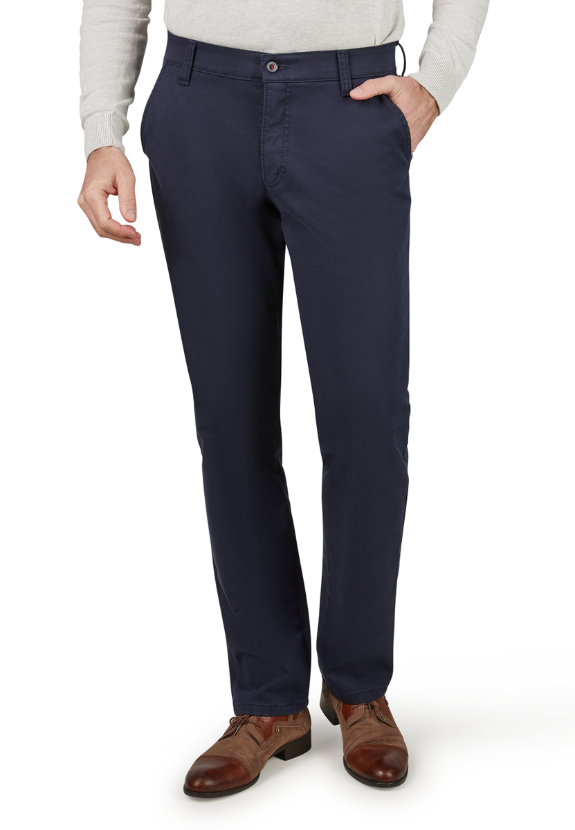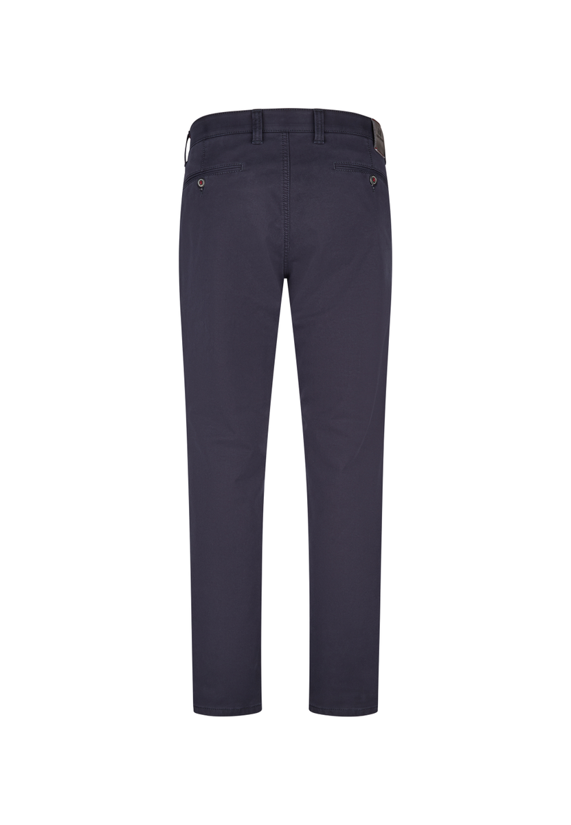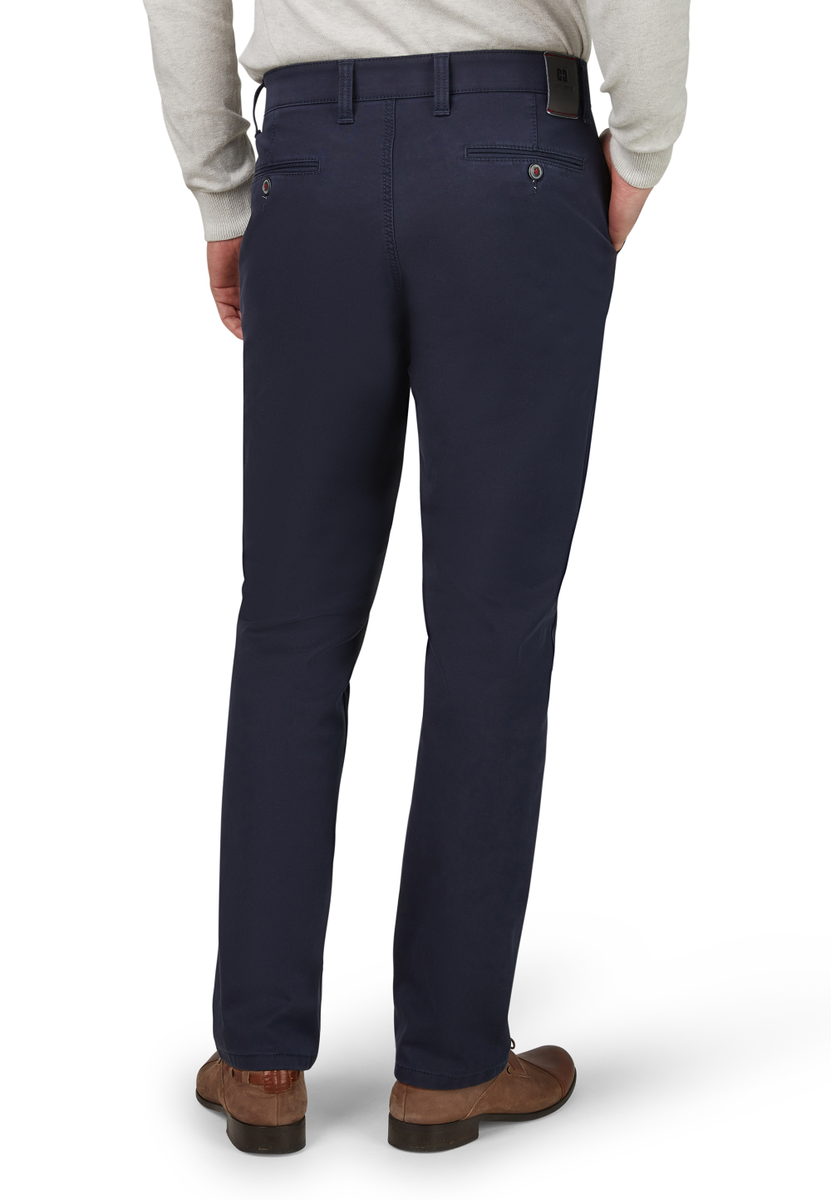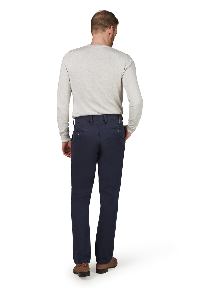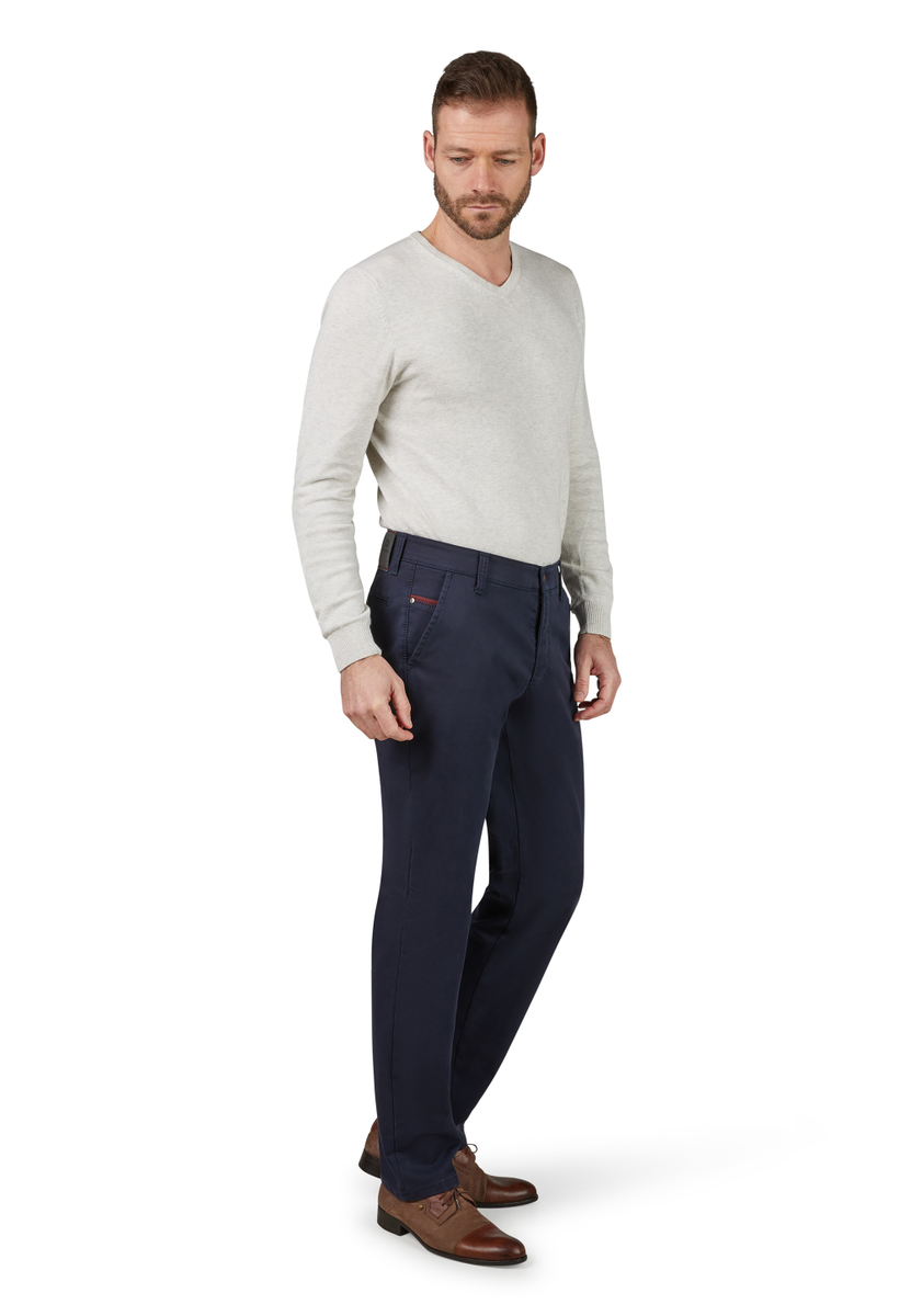 Bequeme Flat Front-Hose mit elastischem Komfortbund und Hemdstopper. Die Münztasche in der rechten Seitentasche bringt einen Hauch Sportivität in den Look. Gerfertigt aus einer High Stretch-Baumwolle mit Thermolite-Wärmeisolierung. Hier wird ein High-Tech-Gewebe aus THERMOLITE® Micro-Fasern direkt auf die Geweberückseite bondiert, das aus Hohlfasern besteht, in dem warme Luft gespeichert und bei Bedarf wieder abgegeben wird. Gewicht: 495 g/lfm. Das Modell bietet eine normale Leibhöhe und wegen der schmaleren Fußweite einen schlankeren Beinverlauf