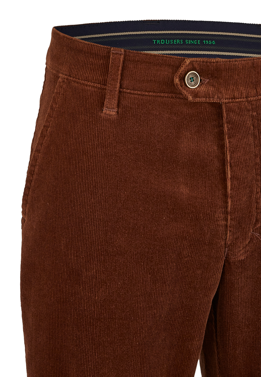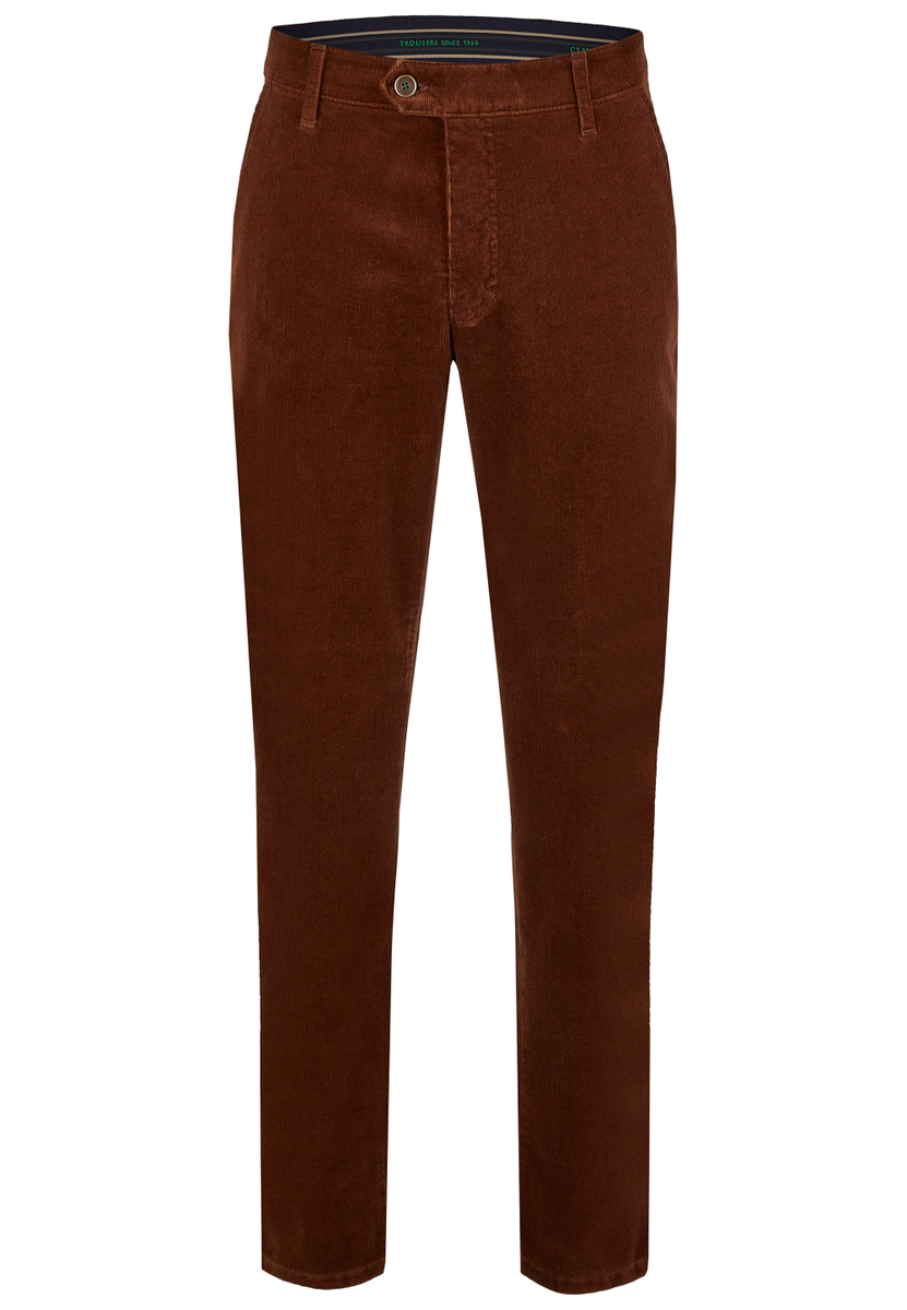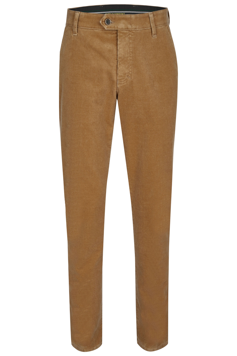 Bequeme Flat Front-Hose mit elastischem Komfortbund und Hemdstopper. Dazu die praktische Bundverlängerung mit Knopf und Haken. Gerfertigt aus einem Feincord mit High Stretch mit weichem Griff in casualiger Optik. Gewicht: 505 g/lfm Das Modell bietet eine normale Leibhöhe und wegen der schmaleren Fußweite einen schlankeren Beinverlauf.