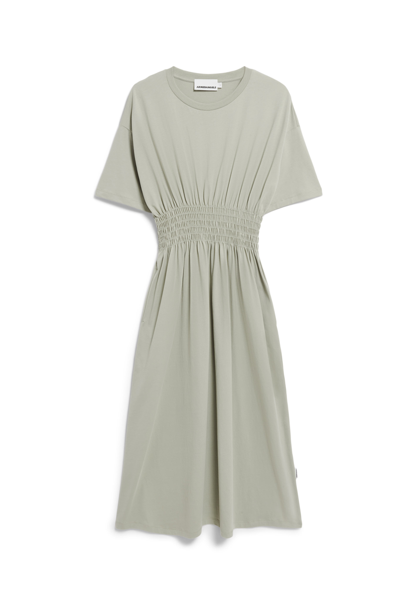 The KIWANAA jersey dress, made from 100% organic cotton, features a flowing midi length and a comfortable fit. The highlight is the elastic, statement waistband that accentuates the silhouette. Side slit pockets add functional details to the design.