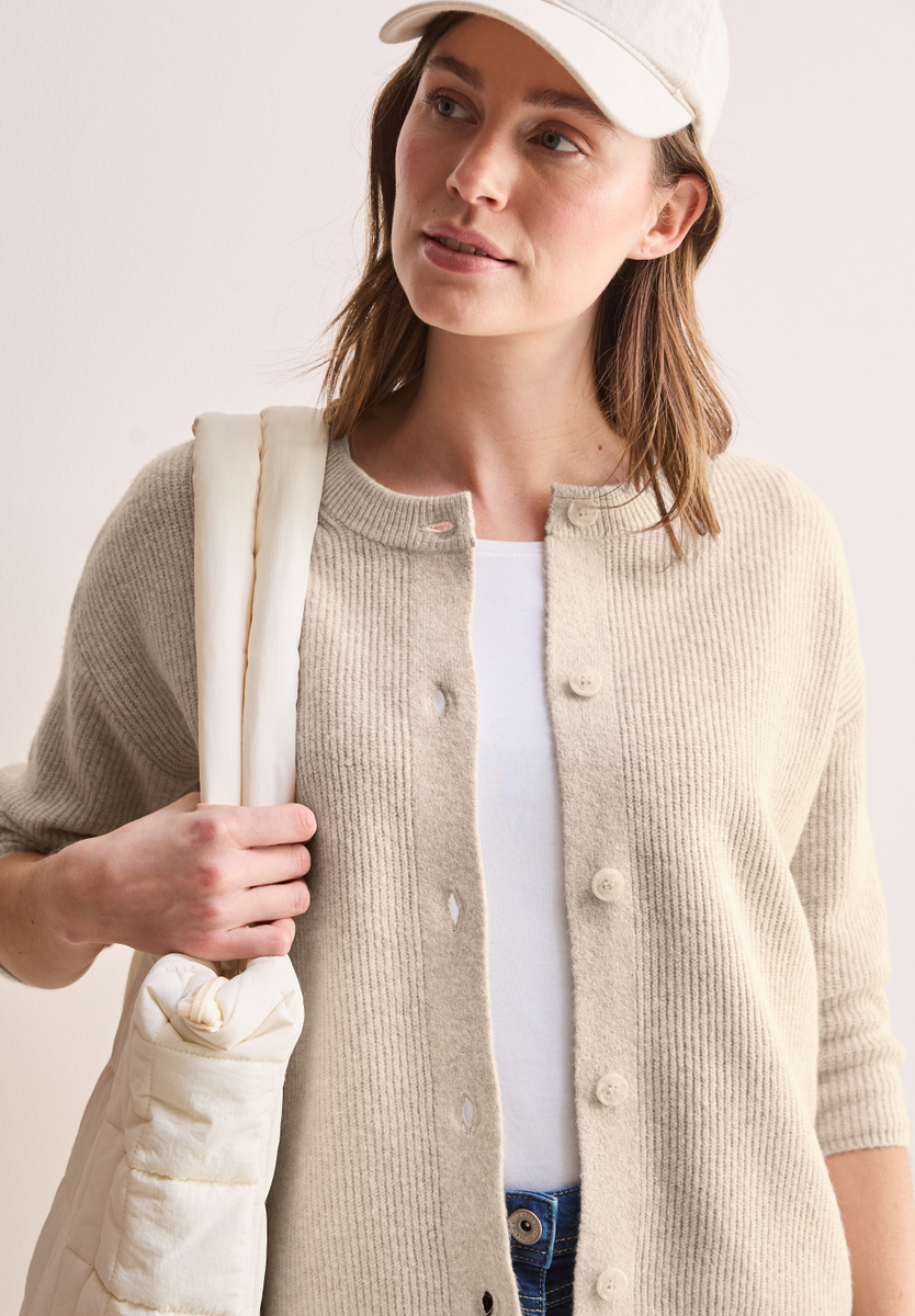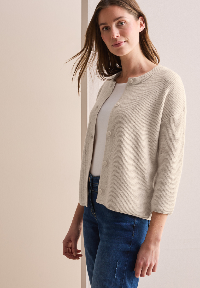 Der kurze Cardigan von CECIL für Damen besticht mit einem kuscheligen Baumwollmix und einer modernen 3/4-Ärmellänge. Der Rundhalsausschnitt und die Knopfleiste verleihen der Strickjacke einen femininen Touch. Ein vielseitiges Basic, das sich ideal für den Alltag eignet. Kuschelige Strickjacke Rundhalsausschnitt 3/4-Arm Knopfleiste Baumwollmix mit Stretchanteil Material: 37% Baumwolle, 34% Polyacryl, 26% Polyester, 3% Elasthan
