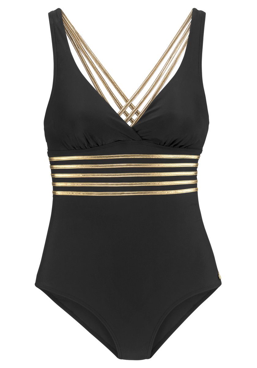 LASCANA Glamouröser Badeanzug von Lascana. Raffinierte Optik: glänzende Einsätze. Haltgebender Miedereinsatz vorne und formende Softcups. Glanzvolle Träger, im Rücken gekreuzt. Weiches Material mit elastischen Eigenschaften.