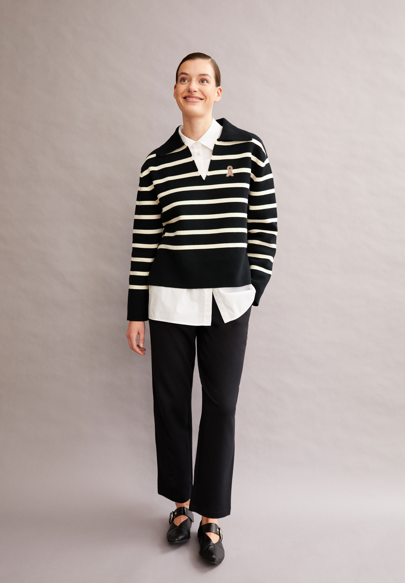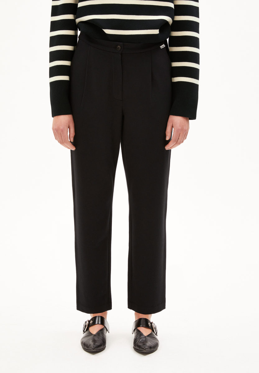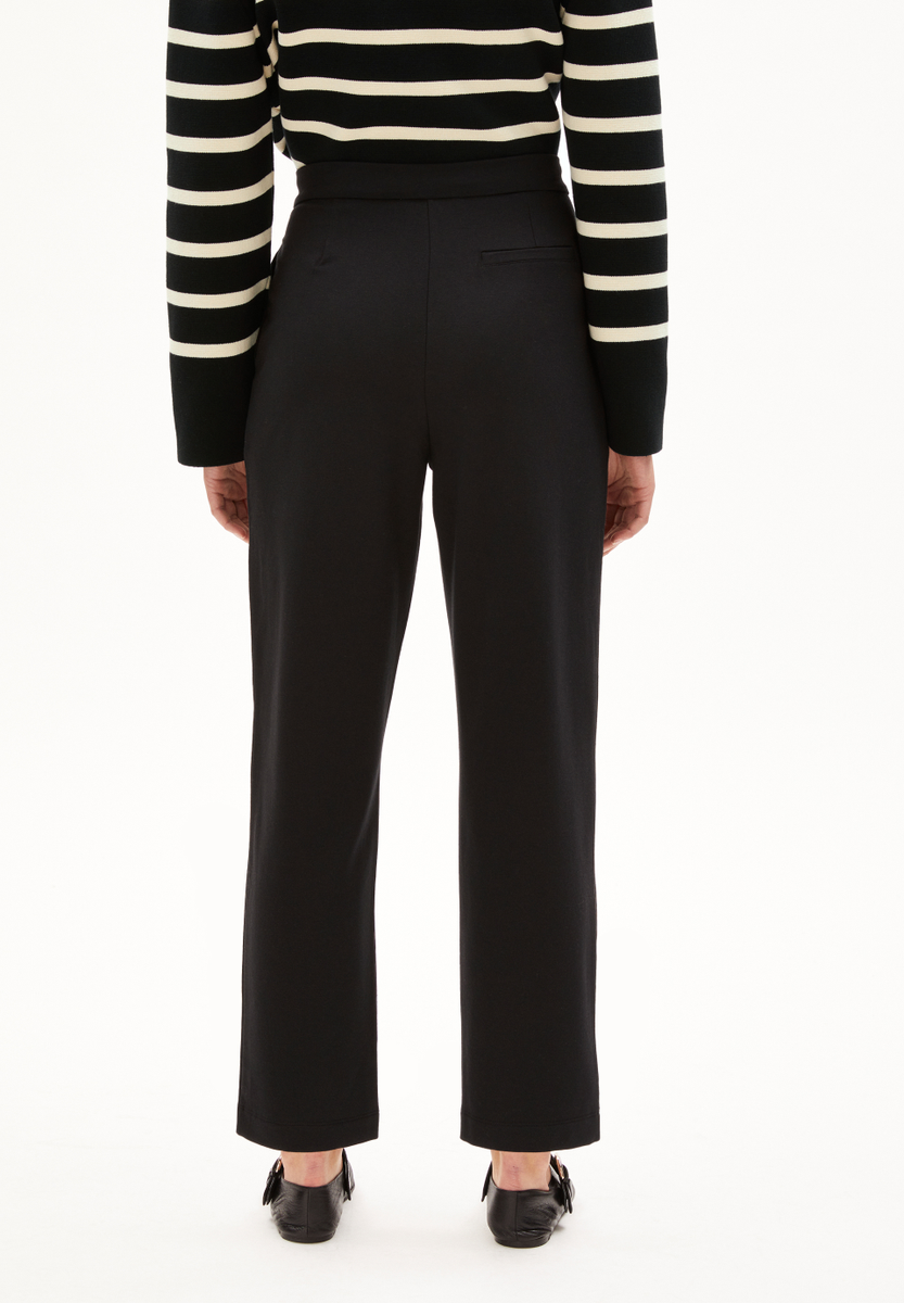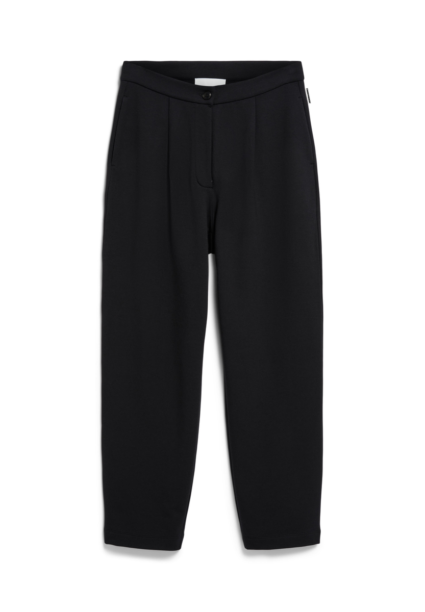 Discover the LIRAA LOU jersey trousers: loose fit, wide leg and ankle-length. They feature side slit pockets, an embroidered pocket at the back and a button and zipper fastening. Pleats and a small label on the left under the waistband complete the design. Made from organic cotton, TENCEL™ modal fibers and a touch of stretch, they are extremely comfortable to wear. Ideal for relaxed days and versatile to combine.