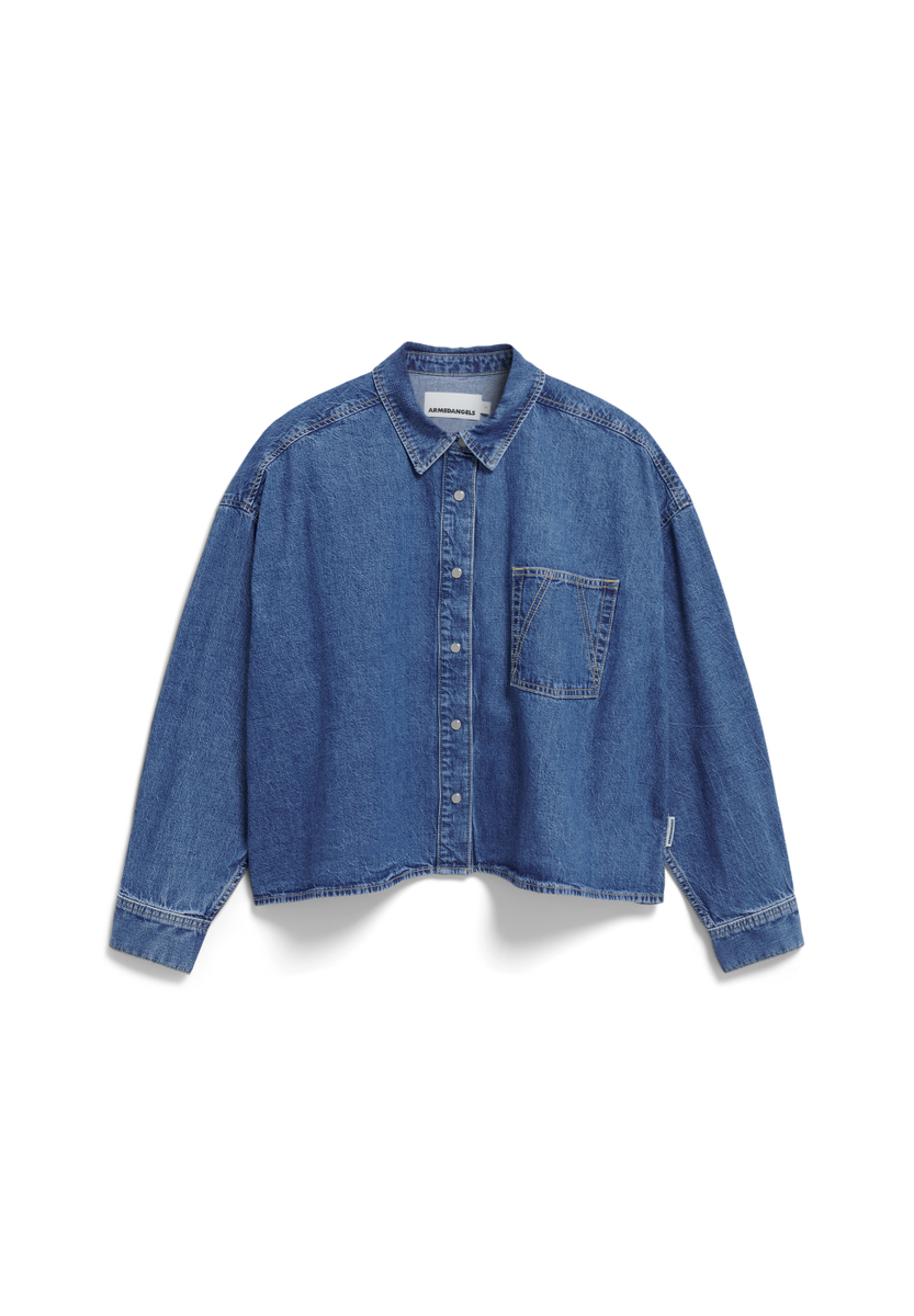 The NALAANI denim blouse is cropped and cut for a relaxed fit. Made from organic and recycled cotton, it features a shirt collar, dropped shoulders, chest pocket, and button placket.