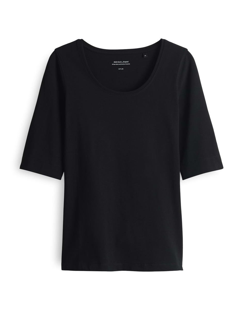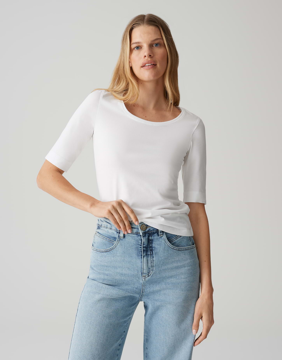 schmale Passform, verlängerter Kurzarm, Rundhalsauschnitt, Rückenlänge ca. 62 cm bei Größe 36, Model Größe 181 cm – trägt Größe 36, BCI Cotton Mix, weicher Griff, elastischer Stoff