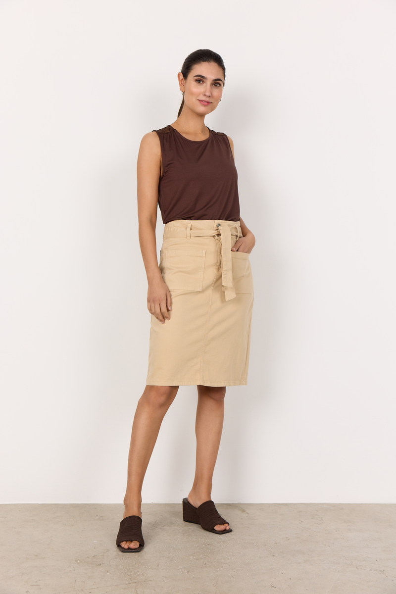 SC-ERNA 26 ist ein knielanger Rock aus einer Mischung aus 97% Baumwolle und 3% Elastan. Dieser Rock hat eine hohe Taille mit Gürtelschlaufen, einen passenden Stoffgürtel und große aufgesetzte Taschen. Kombiniert mit einem taillierten Oberteil und klassischem Schuhwerk ergibt sich ein stimmiger Look für verschiedene Anlässe.