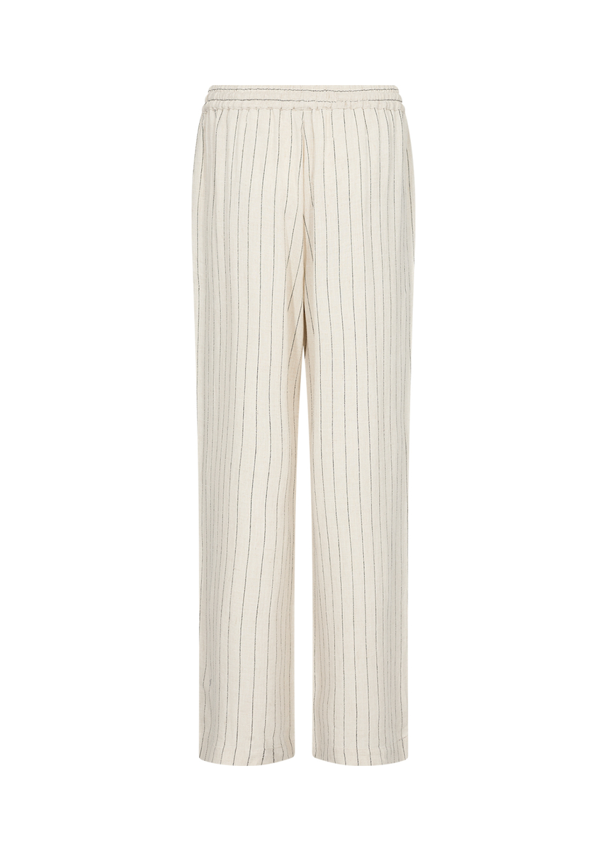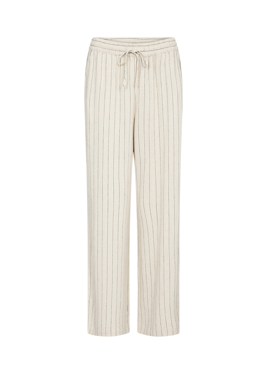 SC-POULA 2-B ist eine Hose aus 70% ECOVERO Viskose, 30% Leinen. Sie hat einen Kordelzug in der Taille für eine verstellbare Passform und vertikale Streifen, die den Look verlängern. Kombiniere sie mit einem taillierten Oberteil oder einem passenden Blazer, um ein komplettes Outfit zu kreieren.