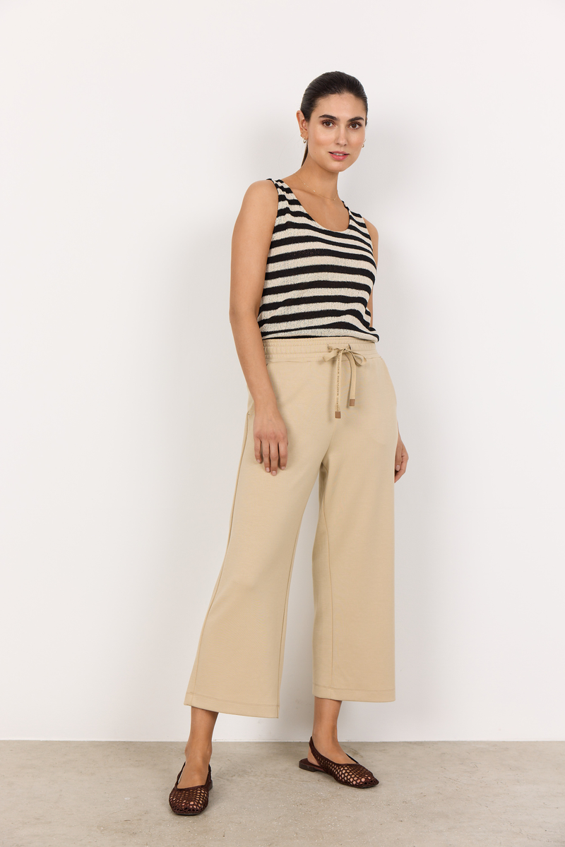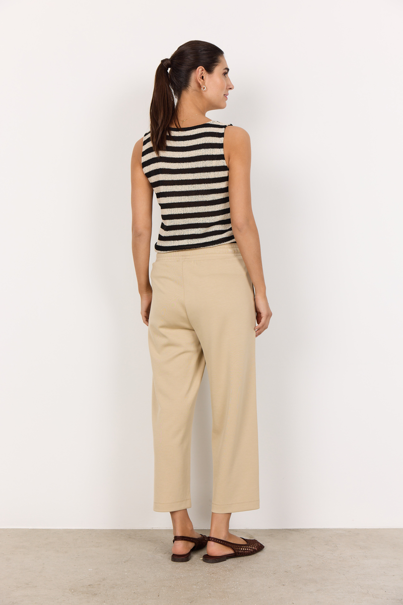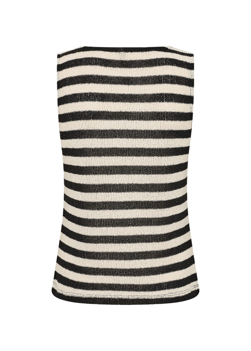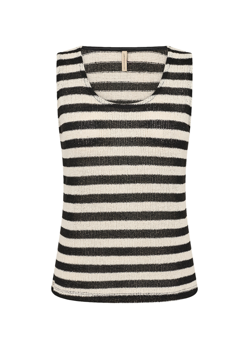 SC-ROSENNA 1 ist ein ärmelloses Oberteil aus einer Mischung aus 40% recycelter Baumwolle, 38% Baumwolle und 22% recyceltem Polyester. Das Oberteil hat einen runden Ausschnitt, ein horizontales Streifenmuster und eine normale Passform, die an der Hüfte endet. Kombiniere es mit einer maßgeschneiderten Hose oder einem Rock für einen ausgewogenen Look, der für verschiedene Anlässe geeignet ist.