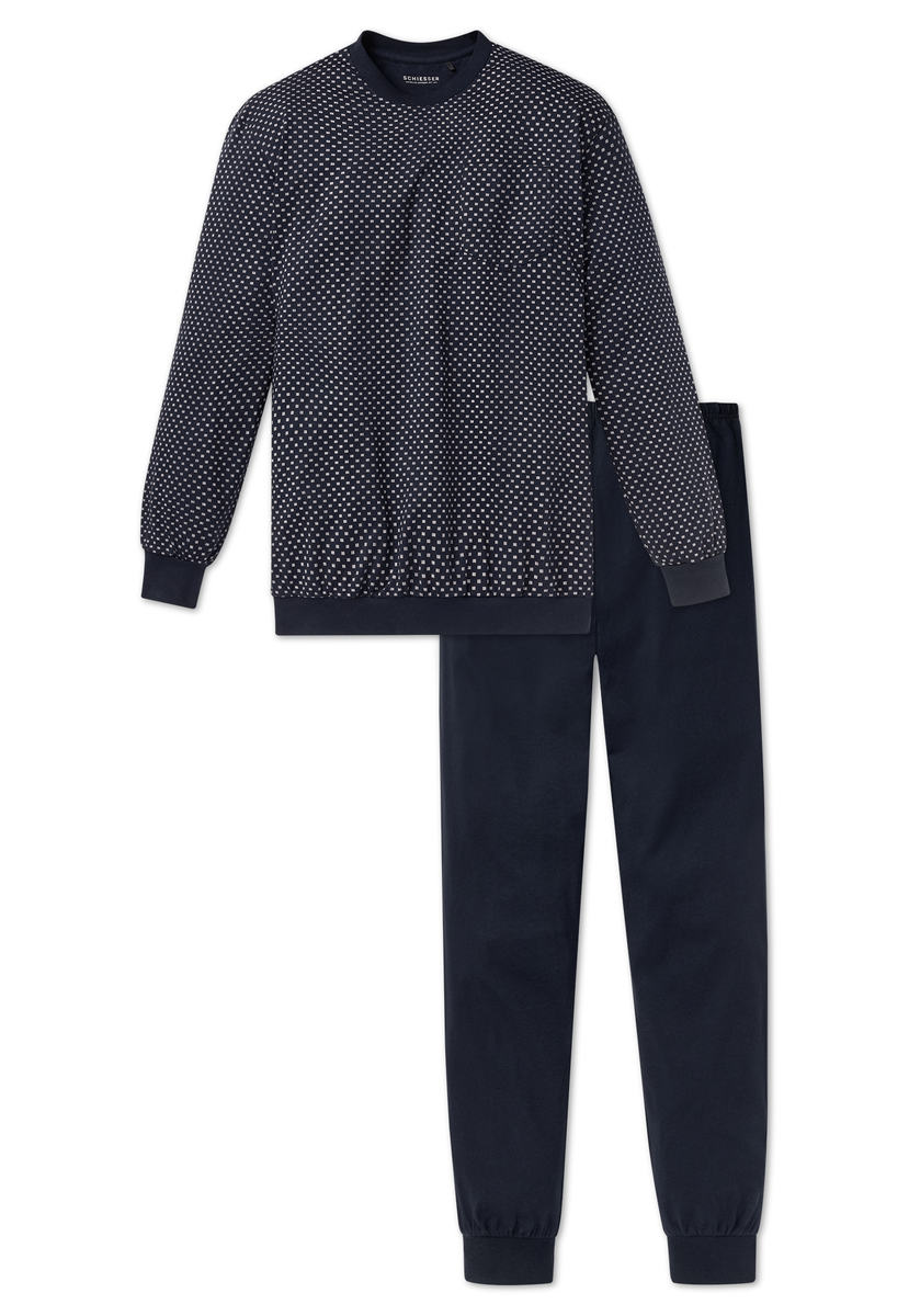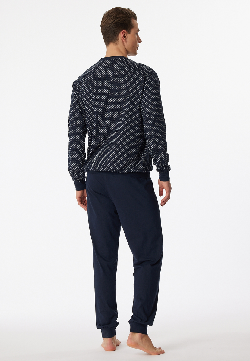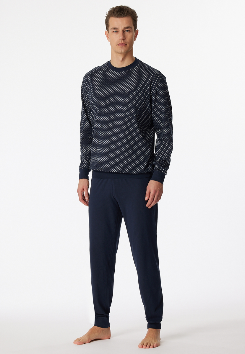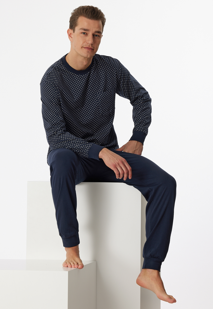 Bei diesem langen, dunkelblauen Herrenschlafanzug steht hoher Tragekomfort an oberster Stelle! Feiner Jersey aus 100% Baumwolle fühlt sich dabei angenehm weich an und wird mit den Bündchenabschlüssen stimmig abgerundet. Und auch optisch kann der Zweiteiler punkten: Ein weiß-grauer Minimal-Print schenkt dem Oberteil seinen maskulinen Charakter und bekommen mit der aufgesetzten Brusttasche ein feines Details. Genau das Richtige für entspannte Nächte - auch in besonderen Größen erhältlich!