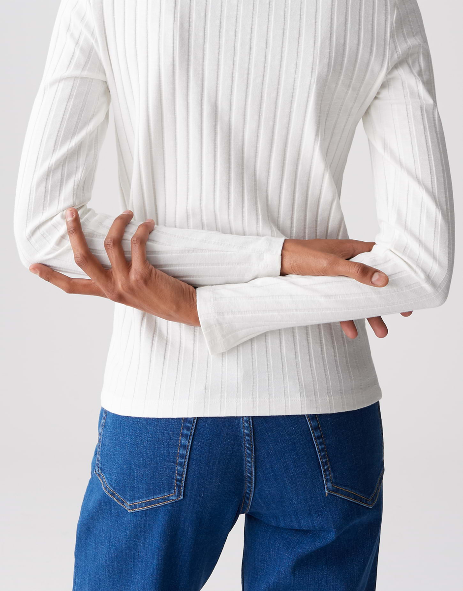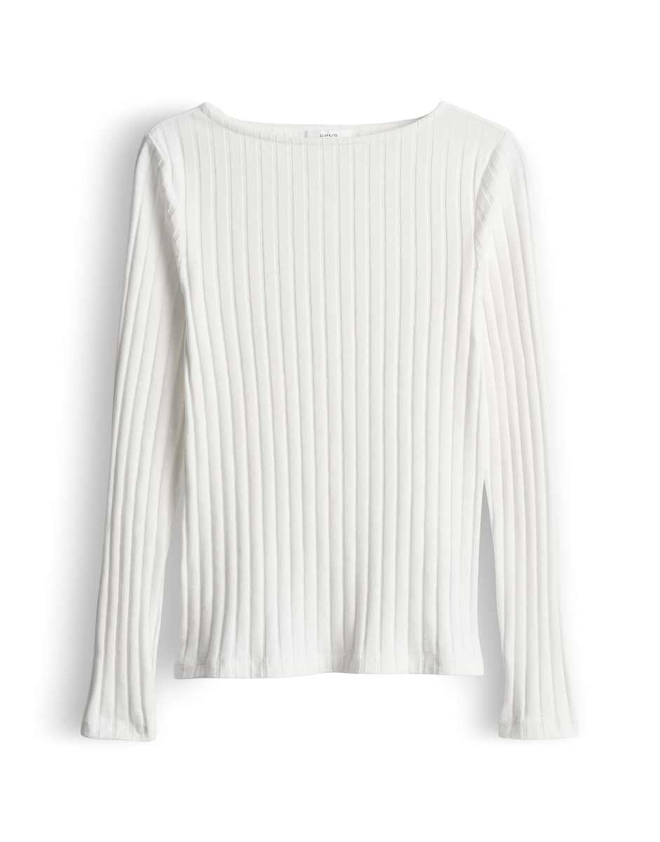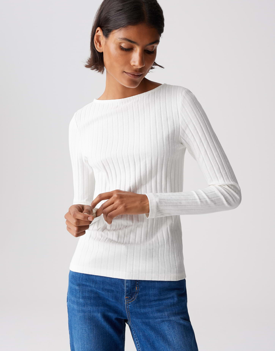 schmal geschnitten, U-Boot-Aussschnitt, Langarm, Rückenlänge ca. 58 cm bei Größe 36, Model Größe 178 cm – trägt Größe 36, Baumwoll Mix, softer Jersey, breite Rippstruktur, easy Basicshirt für jeden Tag, perfekt als Unterzieher geeignet