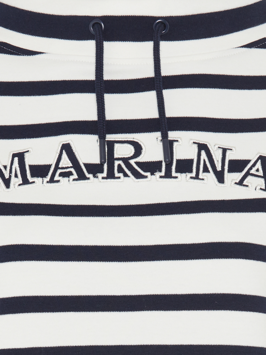 Dieses Jerseyshirt verbindet modernen Stil mit legerem Komfort. Der aufgestellte Kragen mit dekorativem Bindeband verleiht dem Design eine lässige Note, während das Streifenmuster und der Schriftzug „MARINA“ für maritime Akzente sorgen. Der weite Schnitt und die 3/4-Ärmel bieten eine entspannte Passform. Gefertigt aus reiner Baumwolle, überzeugt es mit natürlichem Tragekomfort. Länge: 60 cm.