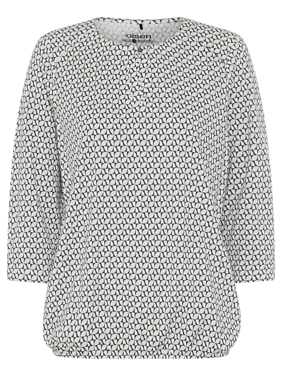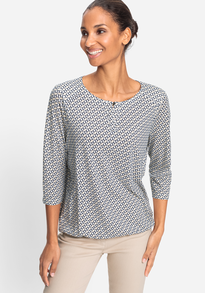 Dieses Shirt mit Ärmeln in 3/4-Länge ziert ein grafischer Allover-Print. Es ist etwas weiter geschnitten und verfügt über einen elastischen Abschlusssaum. Der geschlitzte Rundhalsausschnitt wird mit einem kleinen Knopf verschlossen. Weiterer Pluspunkt: Die weichen und geschmeidigen TENCEL™ Modalfasern, die in diesem Style verarbeitet sind, werden aus nachhaltigem Holz hergestellt und der Produktionsprozess entspricht hohen Umweltstandards. TENCEL™ ist eine Marke der Lenzing AG. Länge ca. 60 cm.