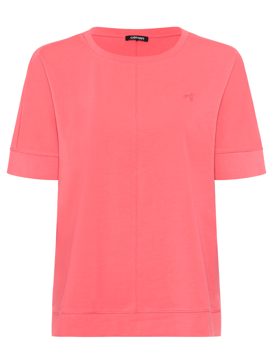 Dieses T-Shirt mit Rundhalsausschnitt überzeugt durch sein schlichtes Design mit einem besonderen Detail: Eine gestickte Blume auf Brusthöhe setzt einen charmanten Akzent. Der weite Schnitt und die 1/3-Ärmel sorgen für ein angenehmes Tragegefühl und eine lockere Passform. Gefertigt aus einer hochwertigen Mischung aus Baumwolle und Elastan bietet es optimalen Komfort und Formbeständigkeit. Länge ca. 60 cm.