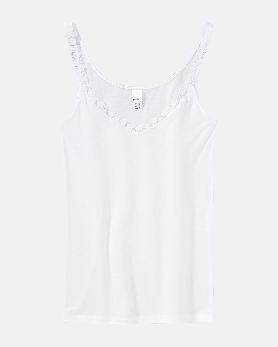 Traumhaft schoenes Traegerhemd Nadine. Das Bluetenmotiv zaubert ein wunderschoenes Dekollete. Ohne stoerende Seitennaehte fuer ein angenehmes Tragegefuehl.