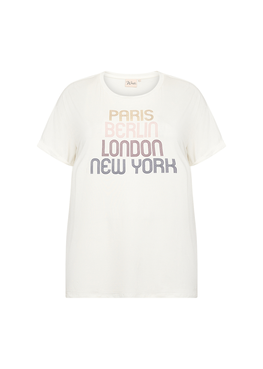 WA-SIBILLE 7 ist ein T-Shirt aus einer bequemen Mischung aus 93% Lyocell und 7% Elastan. Es hat einen Rundhalsausschnitt, kurze Ärmel und einen auffälligen Druck, der eine Reihe von Städtenamen auf der Vorderseite zeigt. Dieses T-Shirt passt gut zu Jeans und Turnschuhen für einen legeren Look oder kann in einen Rock gesteckt werden für einen raffinierten Stil.